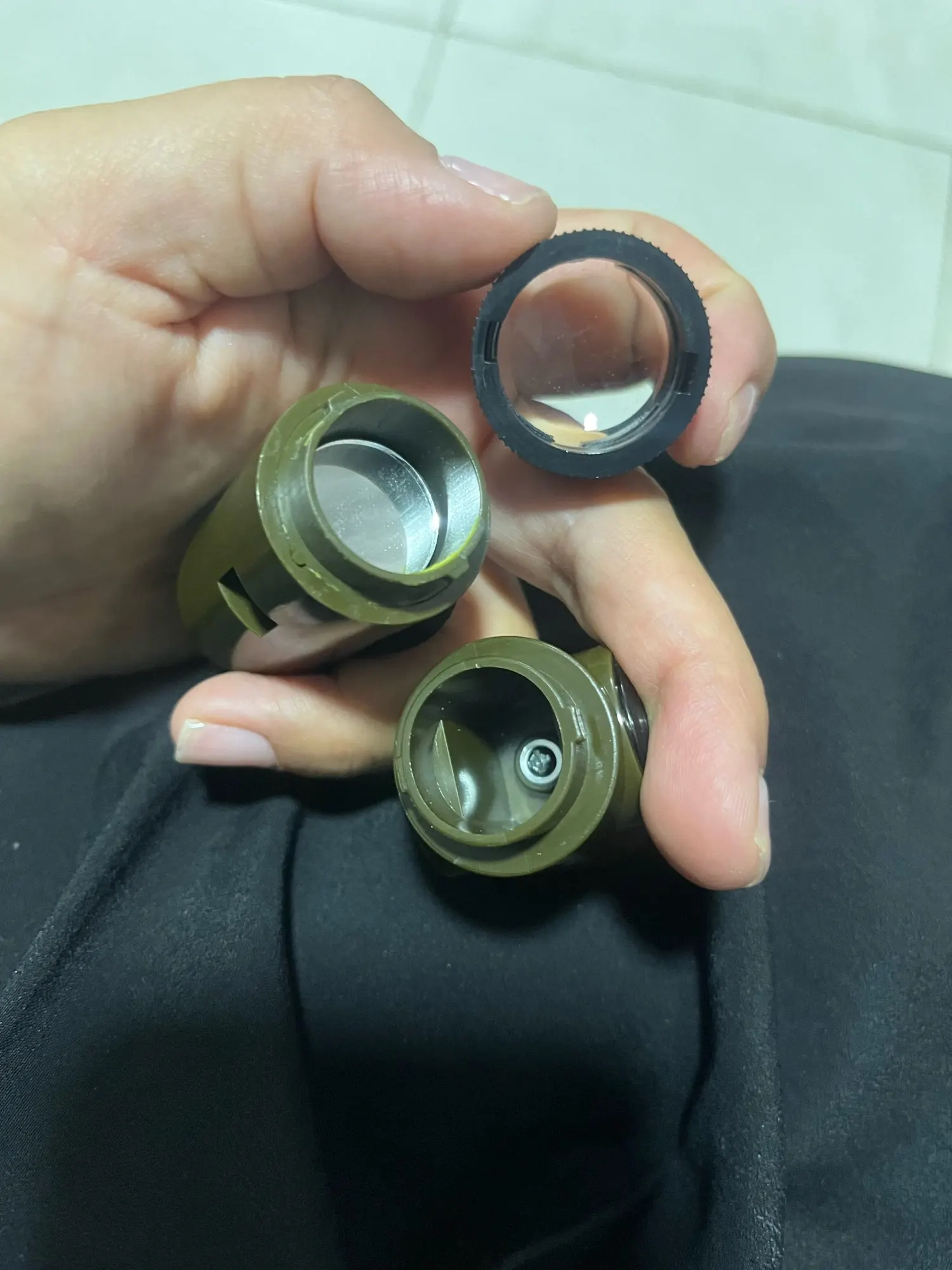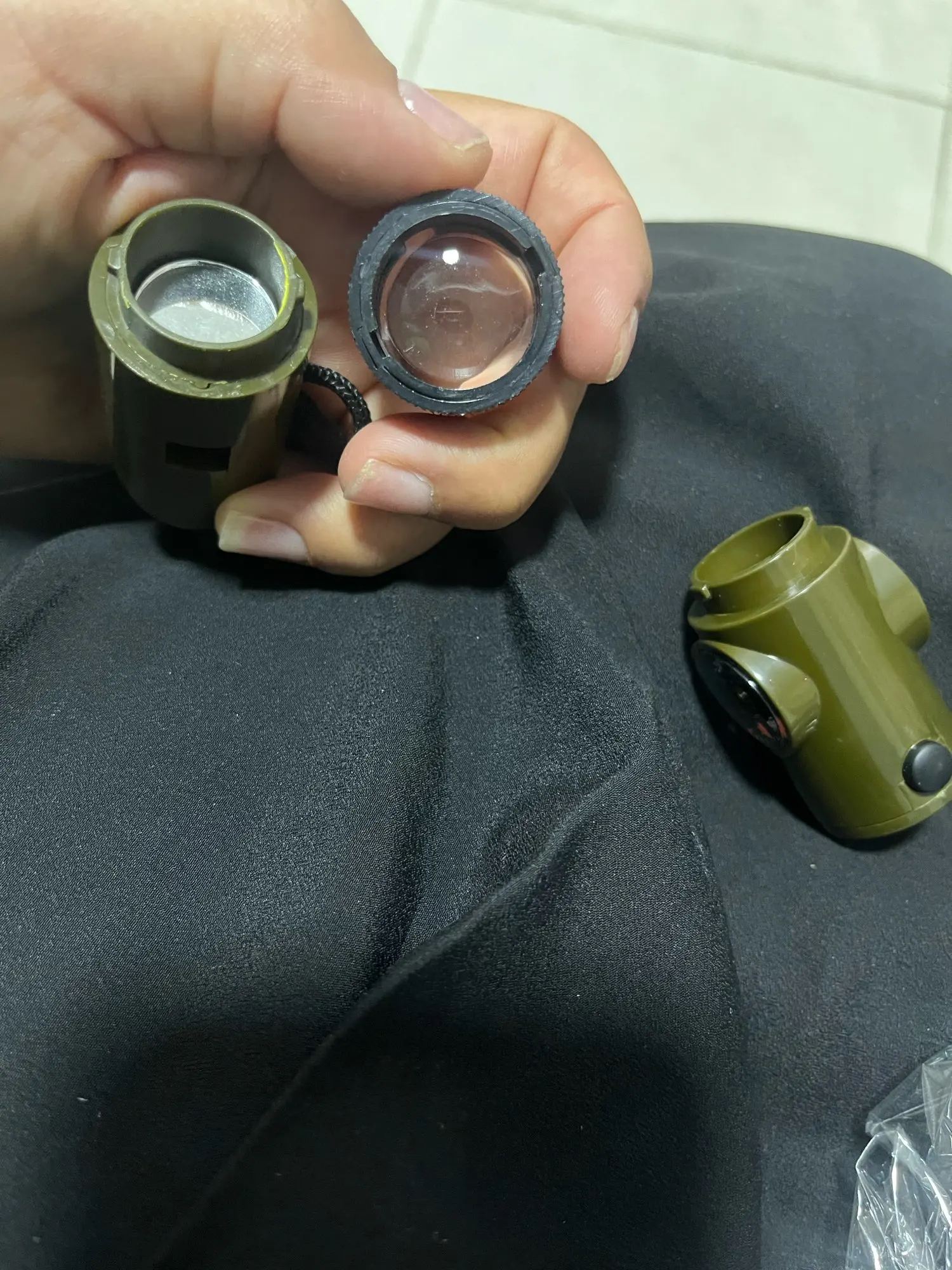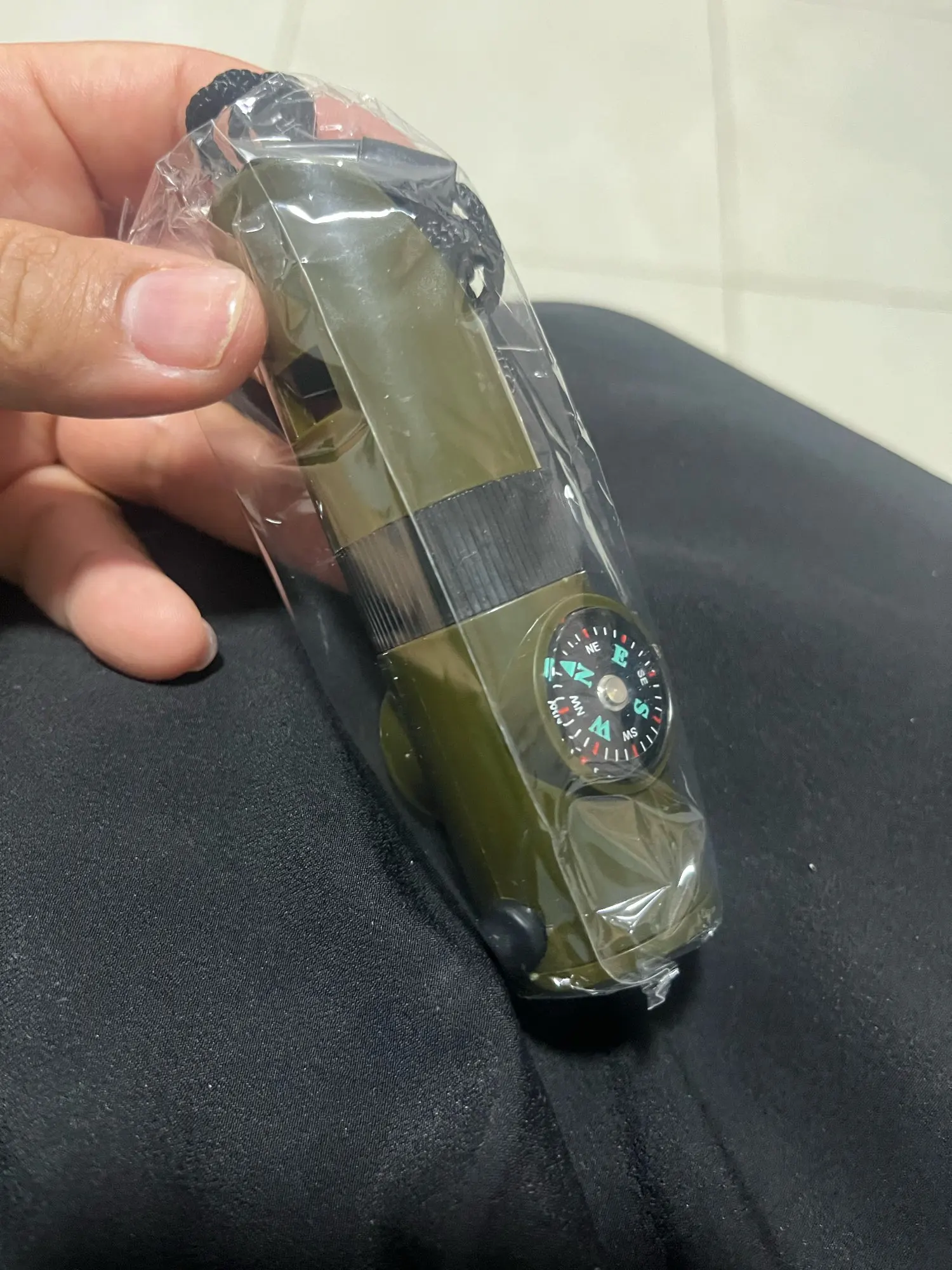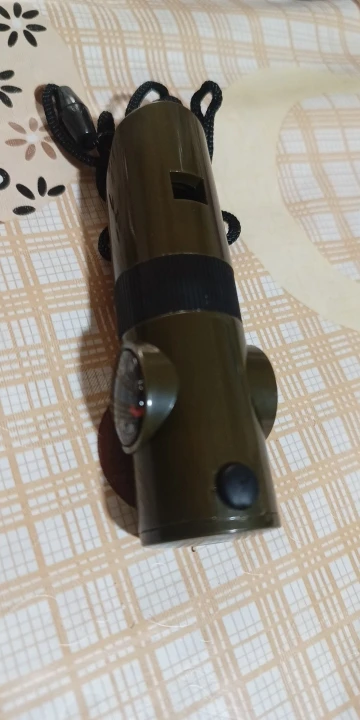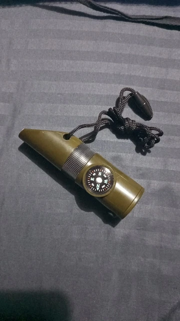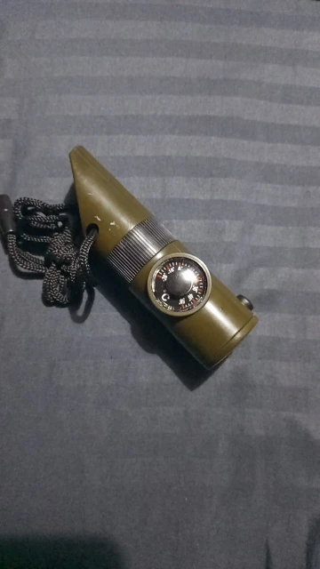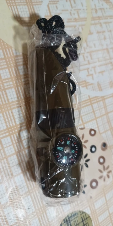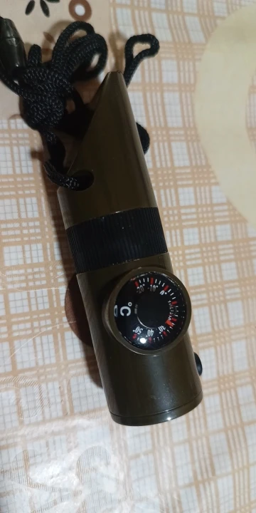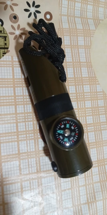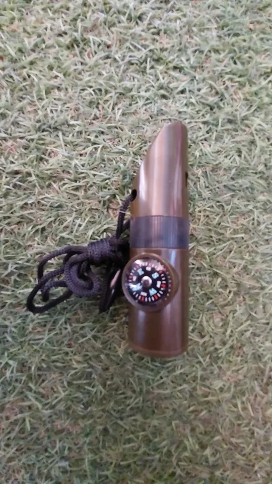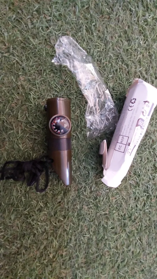 Functions: whistle, compass, thermometer, magnifying glass, reflector, LED light, storage compartment